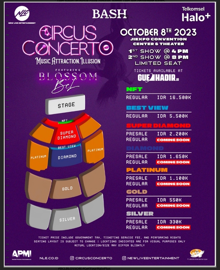 Selain kontribusi performing rights, hal penting lainnya dari New Live Entertainment yang perlu diketahuai adalah mengenai harga dan kelas kategori tiket untuk menyaksikan konser musik Circus Concerto featuring Blossom BCL, tersedia 7 kelas kategori tiket mulai dari kelas terendah Silver, Gold, Platinum, Diamond, Super Diamond, Best View dan NFT.