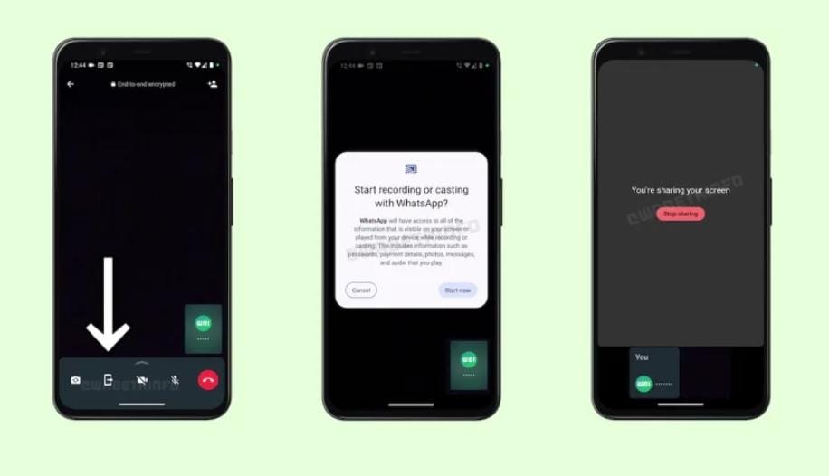Setelah pengguna mengklik tombol baru, sebuah prompt muncul menanyakan apakah pengguna ingin “Mulai merekam atau mentransmisi dengan WhatsApp?” di samping penafian bahwa perusahaan akan memiliki akses ke kata sandi, foto, atau detail pembayaran apa pun yang pengguna tampilkan.